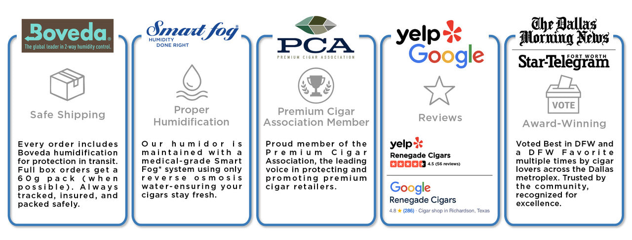 At Renegade, you will find one of the largest humidors in the Dallas area. You will find the best selection of the most popular brands that are desired by people all around the country. Our humidor houses a perfectly curated selection of major brands that you cannot find anywhere else in the cigar world.